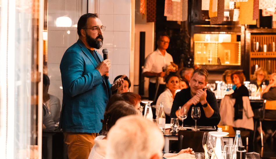 Abbiamo incontrato entrambi all’ultima serata formativa di Mangia&Impara presso Salamensa, uno dei tre locali di Mino e Patrizia Dal Dosso. Un evento con un menù d’eccellenza, a base di carne di Fassona, funghi porcini e vini francesi, Bordeaux e Bourgogne.