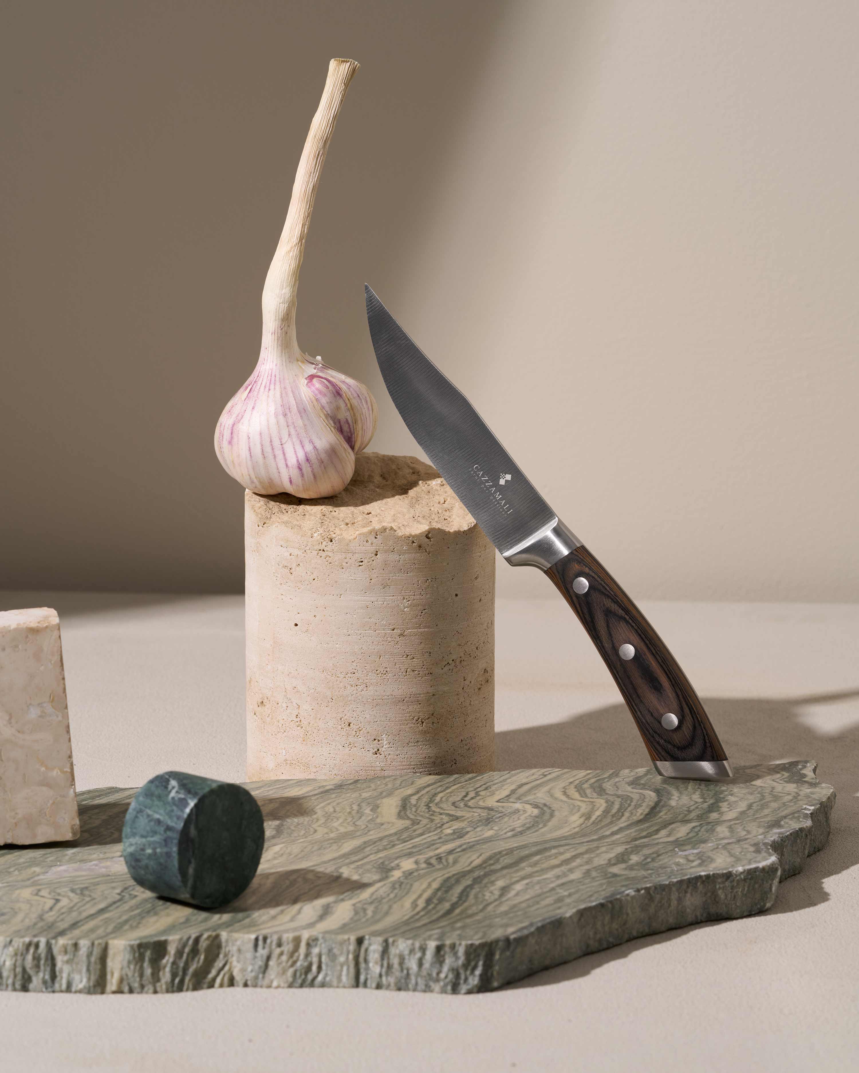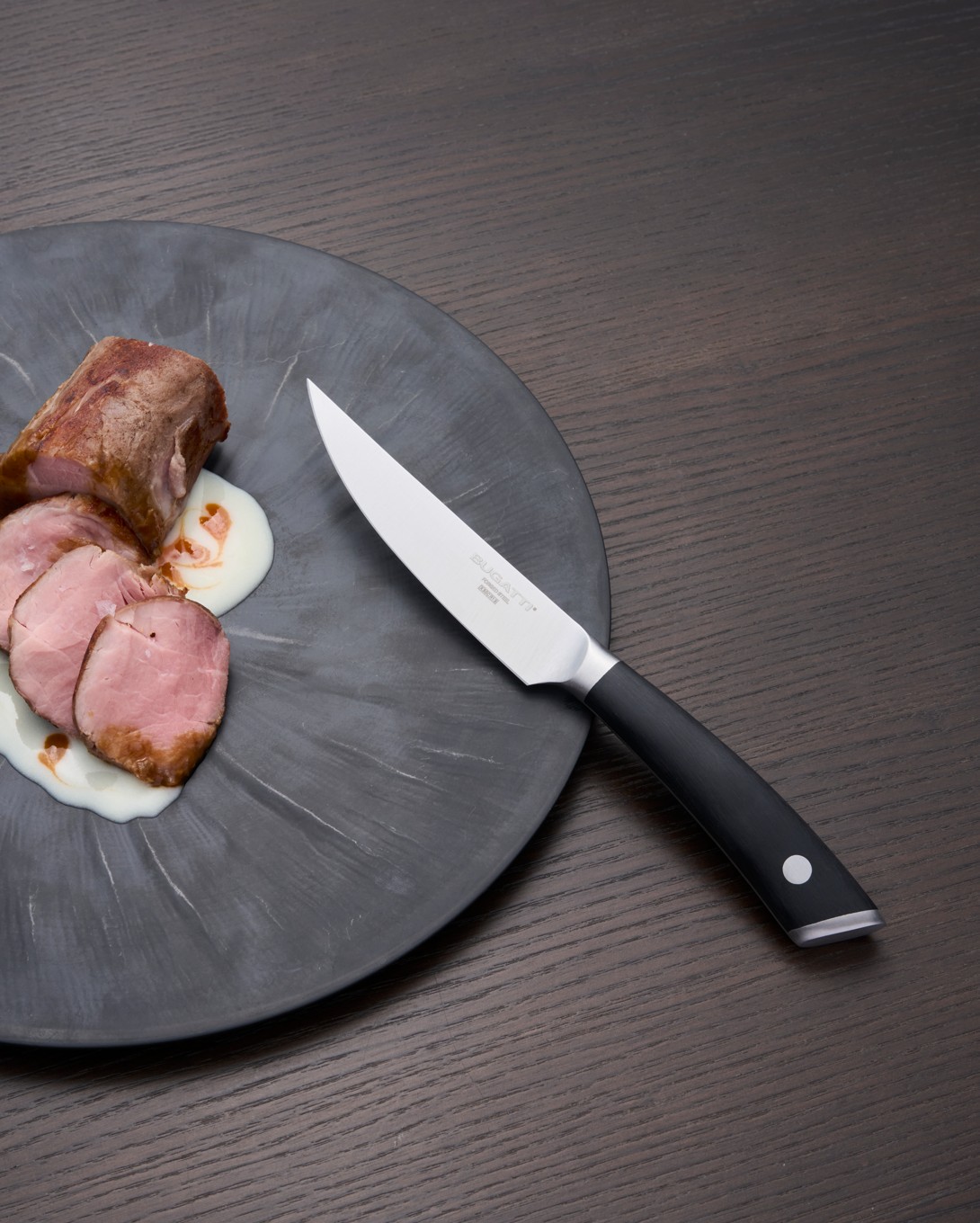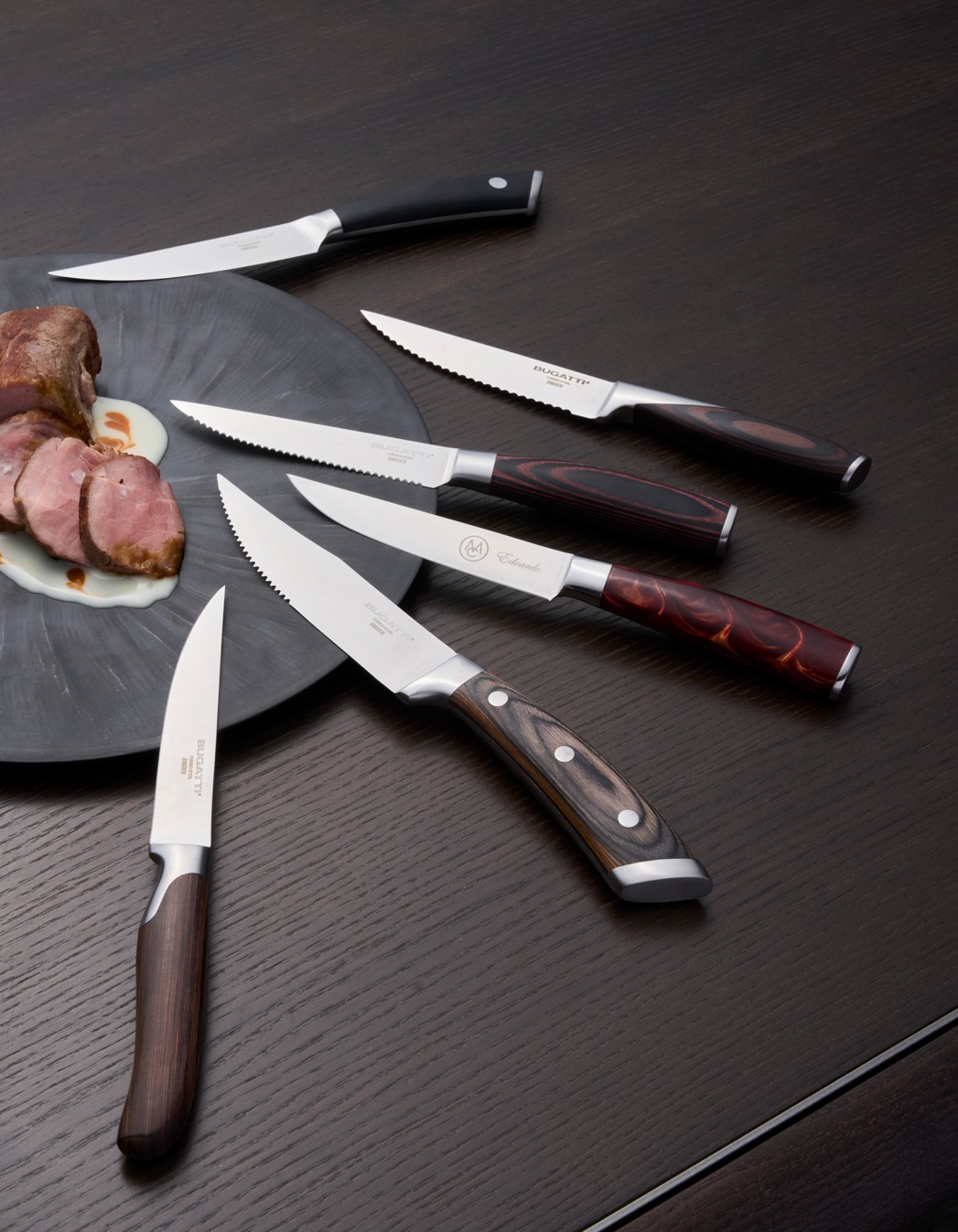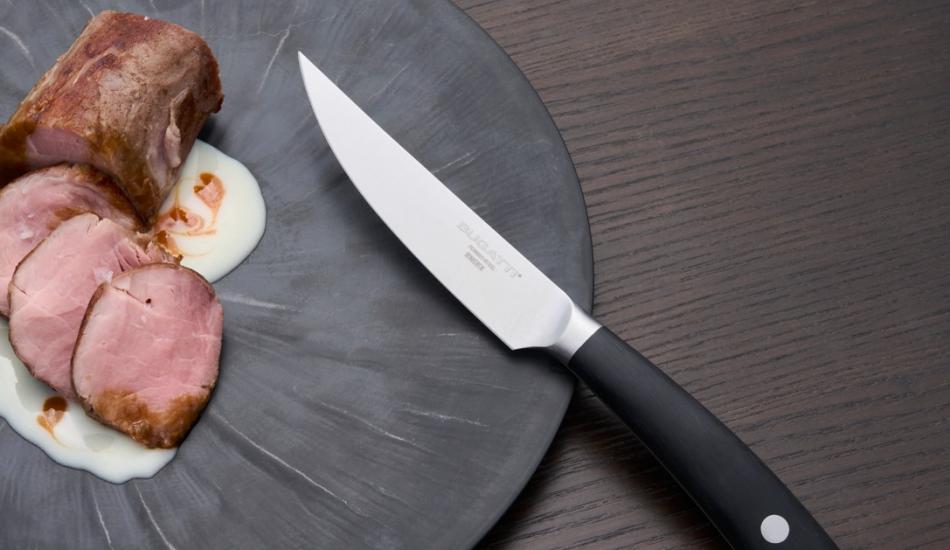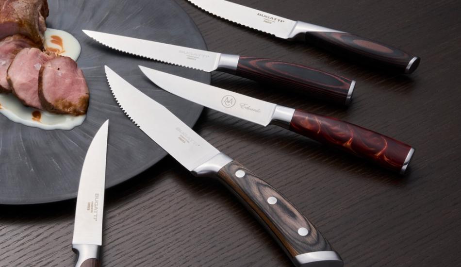 Tra le proposte della Macelleria Cazzamali, troviamo l’icona di questa sintonia: i coltelli da bistecca Bugatti, strumenti, e non esageriamo a definirli tali, nati per chi cerca la perfezione nel sapore, nella forma e nella sensazione che accompagna ogni taglio.